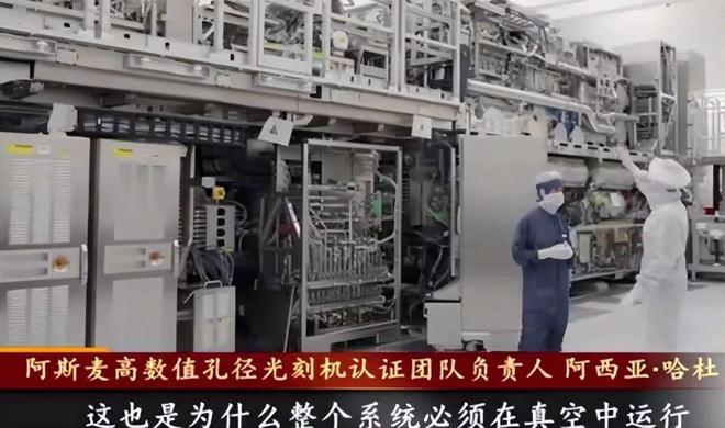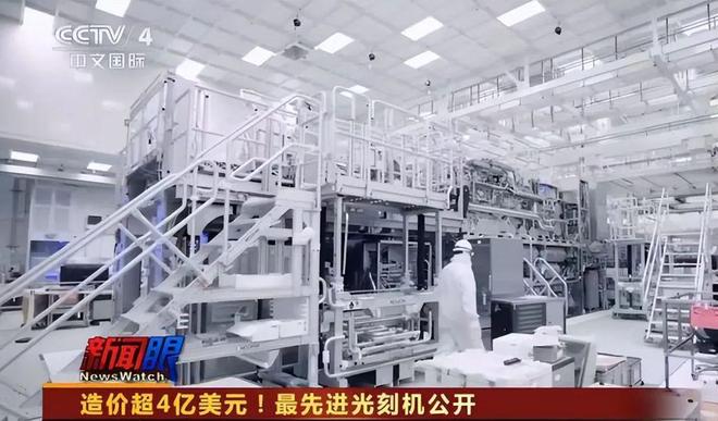 镜头聚焦在一台庞然大物上,乍一看,还以为是什么火箭发射装置,原来这就是当今世界最先进的光刻机——High-NA EUV极紫外光刻机。