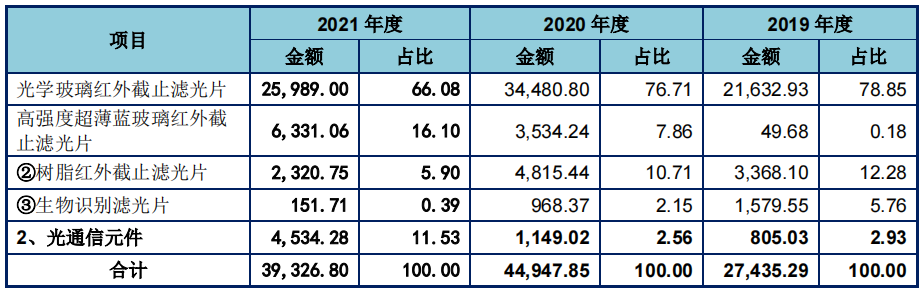 作为主营业务之一,光通信元件2019年度、2020年度及2021年度营收占比分别达到:2.93%、2.56%,11.53%。东田微光通信业务收入自2021年来实现了长足进步,2021年较2020年同比增长了294.62%。