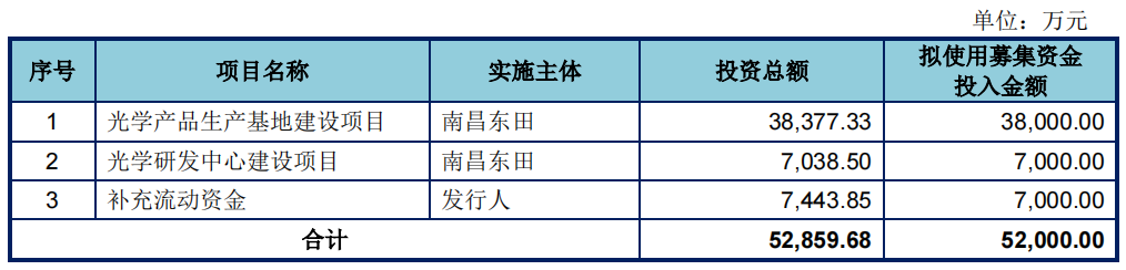 东田微招股书中还透露将募集资金用于基础项目建设,其中:3.8亿元用于光学产品生产基地建设项目;7000万元用于光学研发中心建设项目;7000万元用于补充流动资金。