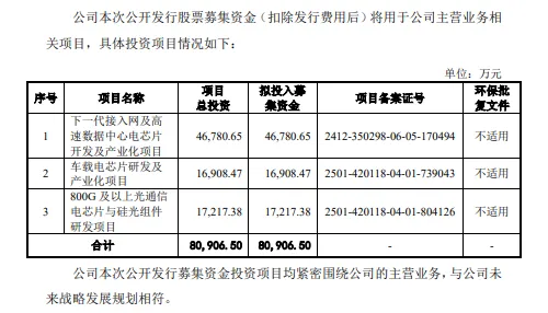 据短平快解读了解,本次IPO,优迅股份拟向社会公众公开发行人民币普通股(A股)不超过2,000万股,募集资金80,906.50万元,用于下一代接入网及高速数据中心电芯片开发及产业化项目、车载电芯片研发及产业化项目、800G及以上光通信电芯片与硅光组件研发项目,拟投入募集资金分别为46,780.65万元、16,908.47万元、17,217.38万元。
