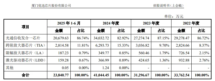 单一产品共性超8成收入。优迅股份的主要产品包括激光驱动器芯片(LDD)、跨阻放大器芯片(TIA)、限幅放大器芯片(LA)、光通信收发合一芯片等,其中光通信收发合一芯片是收入核心,近三年收入分别为2.93亿元、2.73亿元、3.40亿元,今年上半年为2.07亿元,占比86.74%。