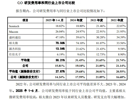 可比同行近三年及上半年的研发费用率均值分别为21.74%、31.65%、31.45%以及30.21%,均超过公司,6家可比同行中,有4家公司的研发费用率远超公司,以2024年为例,Macom、盛科通信、裕太微、源杰科技分别为24.97%、39.61%、74.1%、21.62%,而Semtech、仕佳光子分别为18.8%、9.63%,显然公司还需要进一步加强研发投入。