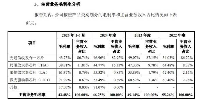 毛利率持续下滑。报告期内,优迅股份主营业务毛利率持续下滑,分别为55.26%、49.14%、46.75%、43.48%,其中光通信收发合一芯片产品的毛利率分别为54.03%、49.07%、46.96%、43.75%,跨阻放大器芯片(TIA)产品同样面临毛利率的下滑,分别为64.48%、47.33%、44.77%、38.71%。