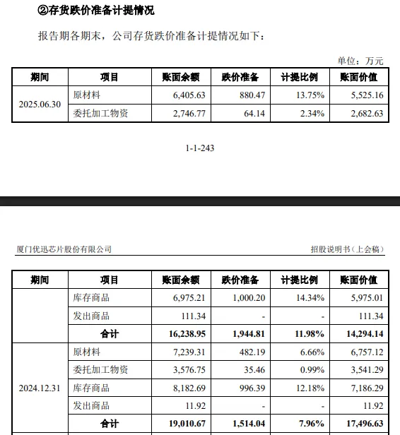 存货高企与损失。报告期内,优迅股份的存货分别为12,978.43万元、9,035.85万元、17,496.63万元、14,294.14万元,占流动资产的比例分别为38.48%、25.45%、32.55%、25.65%,存货以原材料、库存商品为主,期末占比分别为38.65%、41.8%,对应的金额分别为5,525.16万元、5,975.01万元。