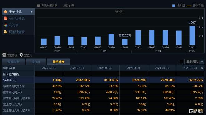 今年一季度营收为6.19亿元,同比增长13.4%;归母净利润为1.04亿元,同比增长30.42%。