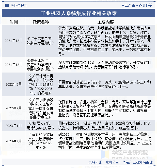 2021年12月,工信部、发改委和科技部等八部门联合印发了《“十四五”智能制造发展规划》,明确提出了“着力打造系统解决方案。鼓励智能制造系统解决方案供应商与用户加强供需互动、联合创新,推进工艺、装备、软件、网络的系统集成和深度融合,开发面向典型场景和细分行业的解决方案。此外,《关于加快场景创新以人工智能高水平应用促进经济高质量发展的指导意见》、《“十四五”智能制造发展规划》等多个政策文件也明确提出要推动智能制造和系统集成的大力发展。国家各级政府部门下发的战略性文件为工业机器人系统集成行业的发展提供了良好的政策环境,随着这些政策的逐渐落实,系统集成行业的未来发展前景将十分广阔。